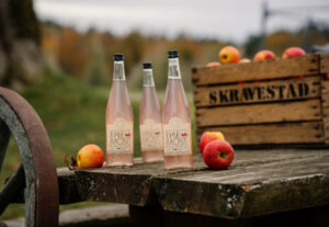 Skravestad selder eplemost av Elstar, Gravenstein og Katja epler fra vår egen eplegård, samt honning fra egne bikuber.